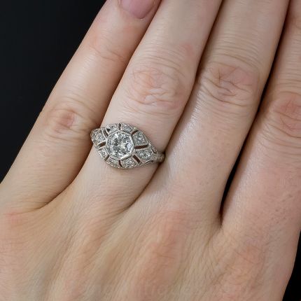 A bright and sparkling European-cut diamond, weighing .65 carat, serves as the crowning glory of this glittering geodesic dome ring, superbly handcrafted in platinum. This consummate Art Deco style jewel is composed of diamond-set geometric sections, each of which is meticulously delineated with fine milgraining and decorative piercing. The beautiful centerstone radiates from within a striking octagonal setting and the top of the ring shank (size 6 1/2) is masterfully hand engraved. A truly stunning and sophisticated tribute to Art Deco jewels.