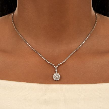 A scintillating icy-white pear-shape diamond, weighing 1.00 carat and accompanied by a GIA Diamond Grading Report stating: D color - SI12 clarity, blazes brilliantly from within a sparkling white diamond frame, all of which are suspended from a diamond-set V-shape that transitions into a gleaming elongated geometric link chain. A timeless, elegant and dazzling estate jewel. Total diamond weight, 2.39 carats. In platinum, it measures 16 3/4 inches.
