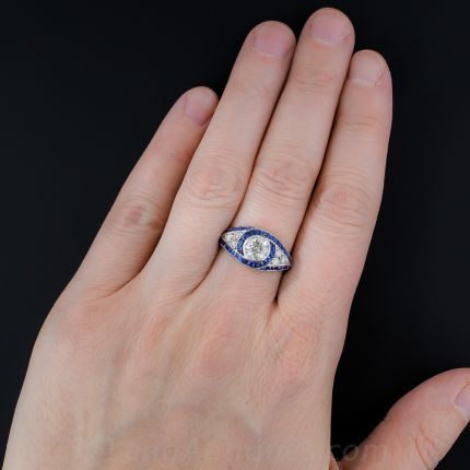 A classic, low-profile, original, early-Art Deco diamond engagement ring from the 1920s. A bright and lively European-cut diamond, weighing 1.01 carats, is embraced by double, mirror-image swirls of French-cut sapphires with sparkling full-cut diamonds (presumable replacements for old mine-cuts) sparkling on the triangular shoulders. Handcrafted in platinum, lease note that due to the design and construction of this ring it cannot be sized smaller than a 7; it is currently size 8 1/2.