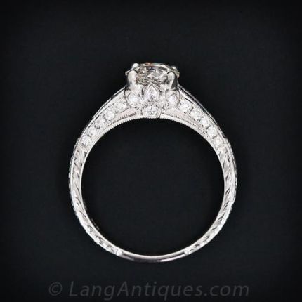 This is a wonderful Art Deco style diamond engagement ring in 18 karat white gold. A 1.01 carat European cut diamond is accompanied by the classic combo of calibre sapphire and diamond accents along the shoulders. Foliate engraving finishes the vintage look!