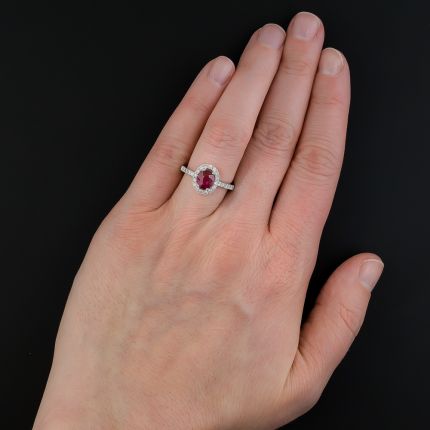 A rich, vibrant, crystalline red faceted oval ruby, weighing 1.01 carats, glistens and glows from within a sparkling white halo of small round brilliant-cut diamonds in this classic estate jewel rendered in gleaming 18K white gold. The ruby is accompanied by gemological report from Stone Group Laboratory stating: No Indications of Thermal Enhancement, Mozambique origin. 7/16 inch, currently ring size 6.