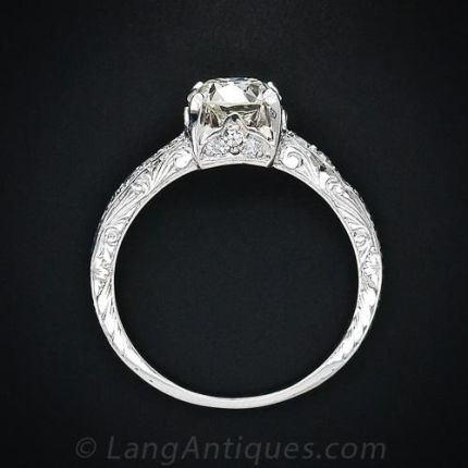 A shimmering 1.05 carat European-cut diamond appears even larger due to the decorative box setting in this tailored, traditional style antique engagement ring from the first or second decade of the twentieth century. A total of twelve tiny single-cut diamonds twinkle from the shoulders and the side gallery with delicate hand-engraving adorning all three sides of the ring shank. Sweet!