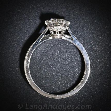 A scintillating round brilliant cut diamond weighing 1.07 cts. is tastefully presented in this French made platinum solitaire and matching wedding band set. The diamond is encircled underneath and flanked on both sides by tiny diamond sparklers. The matching band gracefully curves around the top while hugging the shank. A truly gorgeous combination though the ring is also lovely on its own. GIA certification, French hallmarks on both rings.