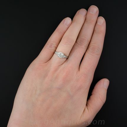 Sophisticated Art Deco style meets traditional simplicity in this chic variation on a classic engagement ring. Hand-fabricated in platinum, circa 1920s-30s, the central 1.09 carat transitional European-cut diamond (graded I color - VS1 clarity by the GIA) sparkles spectacularly between pairs of smaller round diamonds, respectively set in a half-moon followed by a square setting, for a lovely geometric effect. A sleekly tailored and timeless treasure. Currently ring size 5 3/4+.