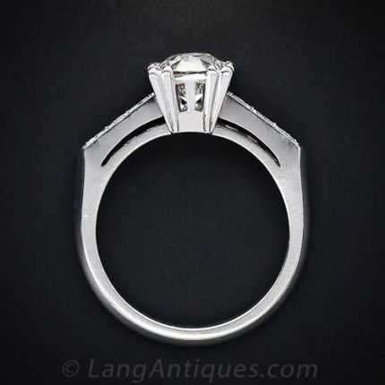 This sparkling estate engagement ring of 1930s vintage features a glistening 1.10 carat European-cut diamond set in a substantial and straightforward platinum mounting set with three round brilliant-cut diamonds twinkling on each shoulder. The center diamonds appears somewhat larger than its actual weight due to the under-lapping border and claw style prongs of the top setting. A superb and solid traditional style estate engagement ring.