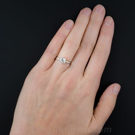 A bright and shining antique cushion-cut diamond (circa 1920), weighing 1.19 carats, somehow found its way into a traditional platinum solitaire mounting by none other than the premier Italian jewelry maestro - Bulgari. Elegant understated elegance par excellence. Currently ring size 6.