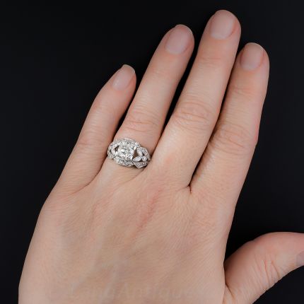A gorgeous platinum openwork Art Deco diamond engagement ring - circa 1930s. The center 1.20 carat European-cut diamond sparkles in a square box head embellished on each side by a trefoil design comprised of marquise and round-cut diamonds. The center section is outlined all around with a finely milgrained, diamond-set geometric frame. This stunning, relatively large scale, engagement ring measures 1/2" long. Ring size 6 1/4.