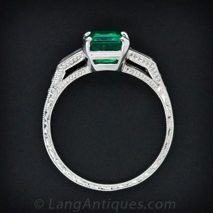 A bright vibrant green emerald-cut emerald, weighing 1.20 carat, is elegantly and traditionally presented in a classic style handmade platinum and diamond mounting. The emerald is flanked on either side by a straight baguette diamond followed by a graduated row of full-cut diamonds running down the shoulders. Hand-engraving and platinum beadwork adorn the sides of the ring shank all around. A beauty.