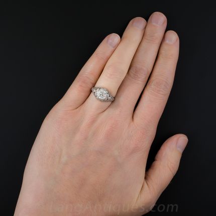 Few if any original Edwardian engagement rings come as fabulous as this rare, radiant and ravishing jewel, hand fabricated in platinum during the first or second decade of the last century. Sparkling front and center is a bright-white European-cut diamond, weighing 1.27 carats, accompanied by a GIA Diamond Grading Report, stating: I color - VS1 clarity. The light, lacy, feminine mounting glitters all around with small single-cut diamonds set in individual foliate/heart settings, and is finished with neoclassic hand engraving. A superlative sparkler, currently ring size 5 3/4. (Hayden Wheeler was a maker of fine jewelry based on Maiden Lane, New York, in operation from about 1850 to the early-1930s.)