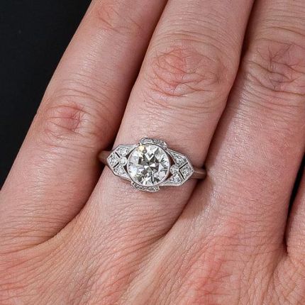 A simply divine 1930s to 40s Late Art Deco ring. Sleek, geometric high-style with a dazzling collet-set 1.47 carat European-cut diamond at the center of it all. Artistic, architectural details throughout are further enlivened by twelve twinkling single-cut diamonds and delicate milgrain engraving. Stunning! Beautifully crafted in crisp platinum, in a finger size 7 1/4.