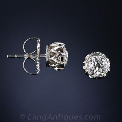 Light up your lobes with these thoroughly sparkling antique diamond stud earrings. The matched pair of old mine-cut diamonds weigh 1.50 carats total and shine from within platinum bezel settings with a soft octagonal outline held aloft by an elegant open scalloped gallery. Tantalizing and timeless treasures.