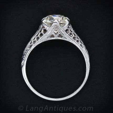 Elegant simplicity well describes this exquisite solitaire diamond ring which dates back to the 1920s. A European-cut diamond, weighing 1.64 carats, sparkles brightly atop a finely detailed open-work setting ornamented with delicate honeycomb filigree. A superb and stunning classic vintage engagement ring.