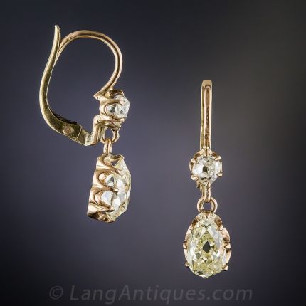 Understated elegance meets extravagant sparkle in these lovely, extremely wearable diamond ear drops, dating from the first or second decade of the last century, composed of a pair of antique pear-shape diamonds ( 1.40 carats total) dangling from a pair of small old mine-cut diamonds (.30 carat), for a grand total of 1.70 carats of dancing dazzle. Hand-fabricated in 14K yellow gold. 3/4 inch.