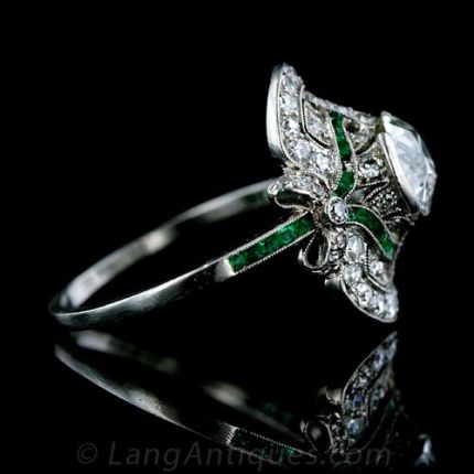 A tisket, a tasket, a diamond and emerald basket! This absolutely exquisite Edwardian diamond ring features a 1.80 carat sparkling European cut diamond set in a semi-bezel surrounded by small accent diamonds and calibre cut emeralds with adorable bow motif shoulders. Pristine Condition.