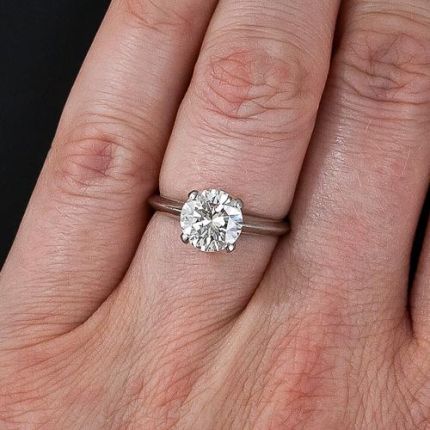 This no-nonsense classic features a seriously scintillating one-and-three-quarter carat round brilliant-cut diamond (1.73 carats exactly) shining solo from atop a sleek knife-edge platinum solitaire setting. Simply sparkling.
