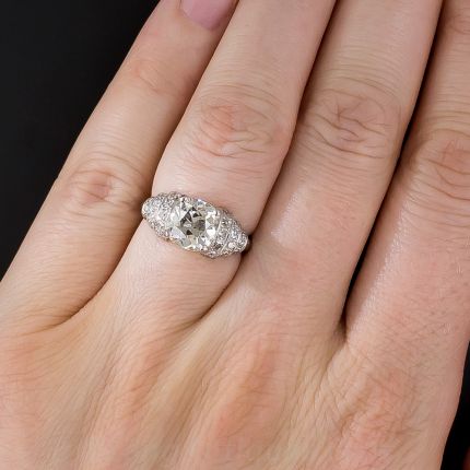 This dynamic deco dazzler features an absolutely stunning antique cushion-cut diamond weighing 1.80 carats. The radiant rock is presented in consummate 1920s Art Deco style between cylindrical sides composed of rolling rows of tiny glittering diamonds. Our hyper-critical staff of in-house gemologists grade the center stone SI2 clarity, however, it definitely leans toward an SI1. This original Jazz Age jewel is hand fabricated in platinum in a ring size 5 1/4.