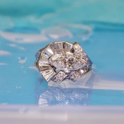 This dramatic and dynamic mid-century dazzler - circa 1950s - stars a bright-white (G color) and beautiful marquise diamond weighing 1.97 carats, but presenting well over two carats in outline. This radiant rock is embellished on the outside with a glistening fan of tapered baguette diamonds and on the inside with rolling diamond-set ribbons. A supreme and stunning sparkler artfully crafted in platinum. The top of the ring measures about 3/4 inch by 9/16 inch. The marquise diamond is accompanied by a GIA Diamond Grading Report stating: G color - I1 clarity (based on a colorless feather inclusion). In a size 7.