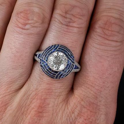 This truly stunning and sensational jewel was recently handcrafted to showcase a bright and brilliant 'light' two carat vintage European-cut diamond in emulation of the very finest high Art Deco aesthetic. The 1.99 carat stone sparkles mightily from atop a platinum dome, intricately adorned with mosaic-like, scissor-cut sapphires artfully arranged in an hypnotic, four-row swirl pattern. 'V' shape diamond and calibre sapphire shoulders decoratively support the top and a graceful openwork gallery adds a finishing flourish. A radiant and remarkable treasure. Ring size 7 1/4, about 5/8 inch diameter. N.B. The center diamond is graded SI2-I1 due to an 'eye-clean' white feather inclusion off to one side. Ring size 7 1/4.