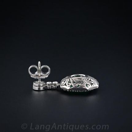 A spectacular pair of original Art Deco drop earrings highlighting a dazzling pair of bright green (much greener than pictured), square emerald-cut Colombian emeralds. The emeralds measure just a tad over 6.00 carats each (12.25 cts total weight)and are tastefully framed by round diamonds and a row of baguettes. The emeralds are suspended from a pair of half-carat each European-cut diamonds. All in platinum with a pierced scroll gallery.