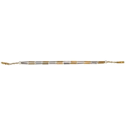This double Retro bracelet has been fashioned from a gold and platinum watch chain. The links have a very unique streamlined character. The two-toned simplicity of the bracelet make it an excellent accessory worn with a watch or on its own.