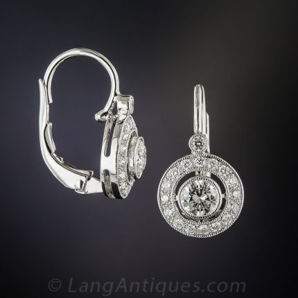 A pair of bright and sparkling, round collet-set diamonds, together weighing a half-carat, float inside sparkling white diamond-set frames. Newly made in rich 14K white gold with lever backs. 5/8 by 5/16 inch. .82 carat total diamond weight.