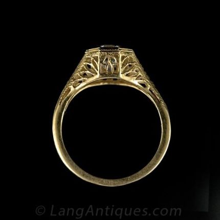 18 Karat rose gold diamond solitaire ring set with a .95 carat European cut diamond. This elegantly tailored diamond ring features a beautifully pierced gallery and foliate motif engraving along the shoulders. The diamond is bead set into an octagonal head.The Diamond is described as follows: One European Cut Diamond Weight: .95 carat Color: K Clarity: SI1