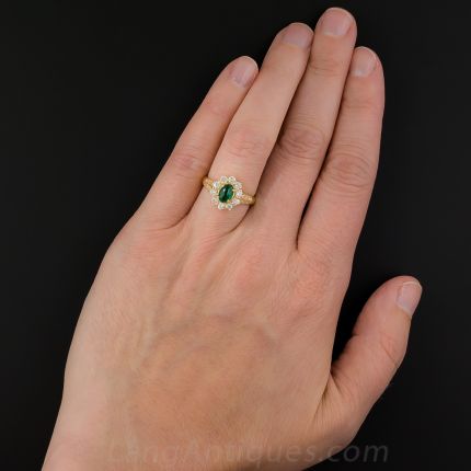 This precious estate jewel, rendered in rich 18K yellow gold, packs lots of punch for it's modest proportions. A gorgeous gemmy green cabochon emerald fills a sparkling white diamond halo composed of round brilliant-cut diamonds with double rows of tiny round diamonds enlivening the shoulders. .75 carat total diamond weight, 1/2 inch, currently ring size 5 1/2.