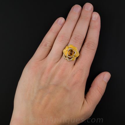Chic, unique and magnifique! This thoroughly captivating monochromatic floral creation, rendered in rich 18K yellow gold and topped with shimmering yellow gold enamel petals, glistens front and center with a glowing honey colored sugarloaf cabochon Citrine faceted on the back for enhanced light dispersion. The golden petals are embellished with tiny sparkling round brilliant-cut diamonds, and a pair of golden leaves adorn the shoulders. 7/8 inch, currently ring size 8.