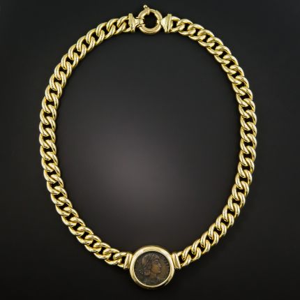 Inspired by the iconic designs of Bulgari, this classic Italian-made necklace, crafted in richly gleaming 18K yellow gold, highlights an ancient Roman coin (minted in bronze or copper). Signed and sold by Klaus Murer, formerly of San Francisco.