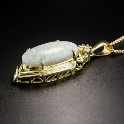 Pretty pastel colored confetti glows within this enchanting, elongated oval white opal presented in gleaming 18K yellow gold, crowned with a sparkling diamond-set quatrefoil design. A tastefully tailored contemporary design. 1 1/2 inches, 18 inch chain, the opal weighs 5.50 carats.