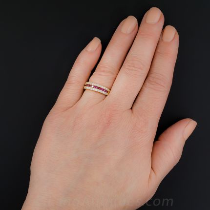 A central row of small bright red round faceted rubies (they don't make 'em any redder) is bordered on each side by bright white sparkling round brilliant-cut diamonds in this sleek and stylish estate band ring, rendered in rich 18K yellow gold. Rubies total .51 carat, diamonds total .62 carat. Currently ring size 5 3/4.