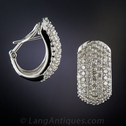 Seven rows of tiny round brilliant-cut diamonds, 144 in all, totaling 3.00 carats, sparkle morning, noon and night in these gently curved, stylishly tailored half hoop earrings crafted in gleaming 18K white gold. Wonderful, wearable, very well priced ear baubles created late last century. 3/4 by 3/8 inch.