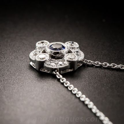 Sweet and petite, newly made in bright 18K white gold, a small collet-set sapphire glistens in the center of a fancy, sparkling diamond frame. 3/8 inch diameter, 16 inch chain.