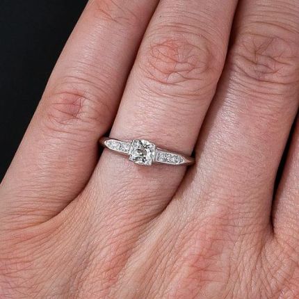 A charming, high-quality .45 carat round mine-cut diamond is featured in a square-cornered trefoil prong setting in this lovely engagement ring from J.R. Wood and Sons, a beloved jeweler of yesteryear. A trio of glittering single-cut diamonds and delicate milgrain engraving add elegance and style to the shoulders of the ring. Hand-fabricated in crisp platinum, this pretty ring sits low on the hand and stacks beautifully with a wedding band. In a finger size 7 3/4.