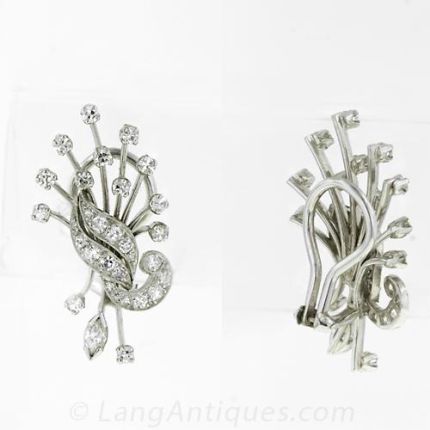 A scintillating bouquet of diamonds, set in white gold, are caressed by platinum and diamond stylized leaves in these classic earclips from the 1950s. The diamonds are described as follows:Sixty Single-cut DiamondsWeight: 0.80 carat totalColor: G-HClarity: Predominantly VSTwo Marquise-cut DiamondsWeight: 0.20 caratColoe: H-IClarity: VS