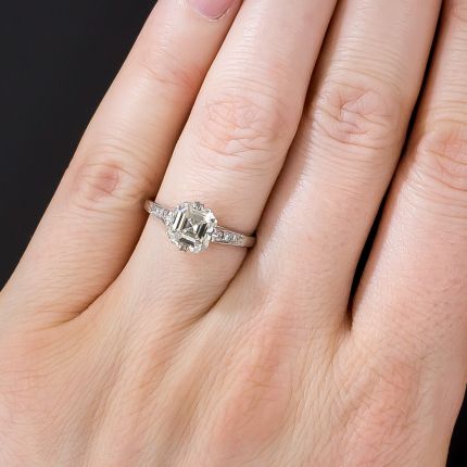 An entrancing, original Asscher-cut diamond, weighing 2.00 carats, shimmers and shines, with minimal fuss, from within a platinum and diamond engagement ring, created at a later date in timeless and traditional style. The gorgeous diamond is accompanied by a Diamond Grading Report from the Gemological Institute of America (GIA) stating I color - VS1 clarity. Simply sparkling in a size 6 1/4.