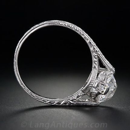 A captivating high crowned antique cushion-cut (or Regent-cut) diamond weighing 2.03 carats radiates from this beautifully executed Art Deco inspired mounting. The platinum is worked in an engraved foliate pattern with milgrained and beaded edges, enhanced by 14 full-cut diamonds set in the crown motif gallery and down the shoulders. Fit for a princes!