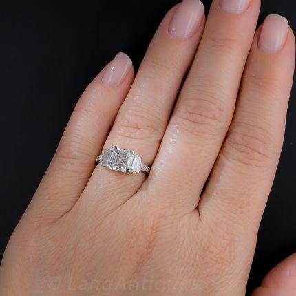 Few come as fine and fabulous as this rare and ravishing original Art Deco Engagement Ring - circa 1930s - featuring a high-caliber 2.06 carat Asscher-cut diamond. The superlative stone, accompanied by a GIA Diamond Grading Report stating: G color - Internally Flawless, is set in platinum and radiates between a shimmering pair of straight baguette diamonds with a trio of Swiss-cut diamonds glittering at the top portion of the ring shank. A trophy ring for a trophy bride! Ring size 6.
