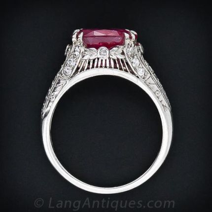 A fabulous original Edwardian-era ring featuring a luscious deep bright red oval Burmese Ruby accompanied by an American Gemological Laboratory Certificate stating: "No Heat” and including the following verbiage: "Non-heated rubies are scarce. Rubies are commonly heated to modify their color and appearance". This rare and remarkably beautiful vintage ruby is regally presented in a superb original platinum and diamond Edwardian setting with consummate neo-classical design details throughout. A dream ring, circa 1915.