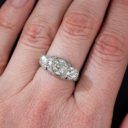An exemplary Edwardian three-stone diamond ring, die-stuck and hand finished in platinum - circa 1920. Three bright and lively European-cut diamonds, weighing 1.40 carats in the center and a combined 1.35 carats on the sides, radiate from within finely milgrained bezels which are ornamented all around with tiny twinkling diamonds set amid beautifully executed decorative piercework and embossed details that continue all around the ring shank. This stunning and forever-sparkling vintage diamond ring contains 2.90 carats total diamond weight. Ring size 6 1/4.