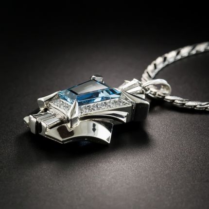 Bold geometric lines inspired by the classic Art Deco designs of the 1920's-'30's, distinguish this striking necklace featuring a gorgeous, cerulean blue trapezoid shape aquamarine. The entrancing gemstone is outlined in small sparkling white diamonds and centers a gleaming multidimensional platinum frame enlivened north and south with fans of bright baguette diamonds. A chic, sophisticated, and stunning high-quality estate jewel measuring 1 inch long by just shy of 7/8 inch wide, suspended a 16 inch textured platinum chain.