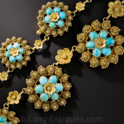 Seventeen gently graduated rosettes, composed of bright Persian turquoise and delicately granulated golden petals, are linked by small golden flowers, in this rare and wonderful Victorian-era necklace, intricately crafted in 20 karat yellow gold. 16 1/4 inches long.