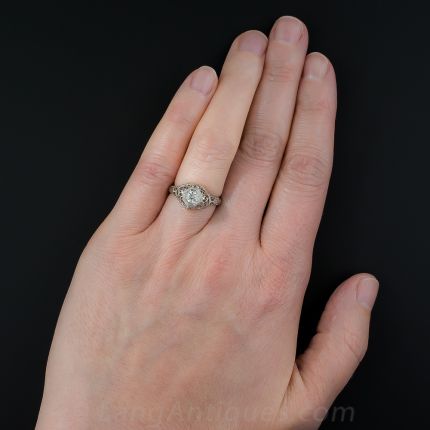 A bright white and sparkling transitional European-cut diamond, weighing just about a quarter-carat, crowns this original Art Deco delight. Die-struck and hand-finished in 18K white gold, circa 1930s, the scintillating center stone beams from within a finely milgrained double octagonal setting, supported by light and lovely filigree. Uniquely lovely. Currently ring size 5 1/2+.