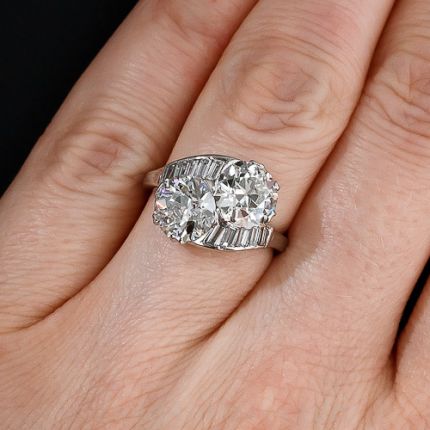 A pair of diamond headlights with their high-beams always on, join forces to create an ultra-mega-watt impact in this fabulous Art Deco twin-stone, or bypass, ring, handcrafted in platinum - circa 1930s. The two bright-white, high-quality European-cut diamonds weigh 1.71 and 1.70 carats respectively (3.41 carats total), and radiate like mirror-image comets with baguette diamond tails. A truly dynamic dazzler. Ring size 5 1/4.