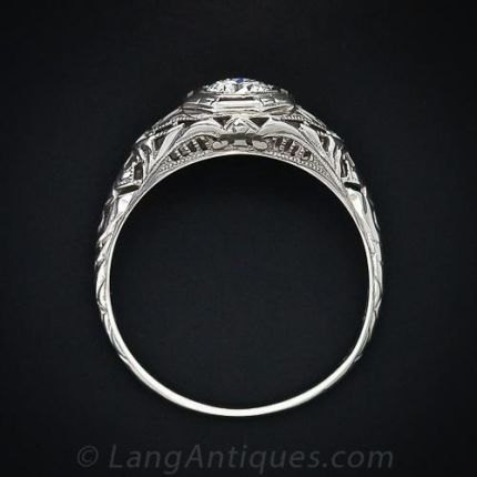 This delicate Art Deco diamond engagement ring features a sparkling .30 carat old European-cut diamond set into a platinum octagonal setting. The diamond is surrounded by intricately pierced shoulders, openwork gallery and milgrained details.