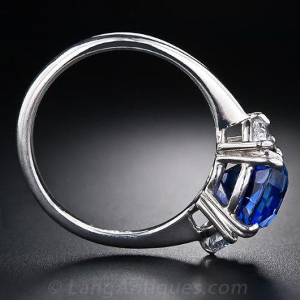 A superb, deep royal blue oval cushion-cut sapphire, weighing 4.29 carat, is closely embraced by a bright colorless pair of half-moon diamonds in this classic and timeless jewel, finely handcrafted in platinum. Breathtaking.