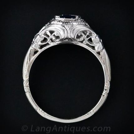 A very sweet sapphire solitaire in 18 karat white gold. A .40 carat round cut sapphire is bead set in an octagonal setting atop openwork scrolls and blossom motifs. Lovely.