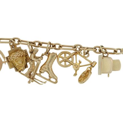 14K Yellow gold charm bracelet featuring cherished movable charms commemorating simpler times. The darling charms include a skier with movable poles, a bicycle with rotating pedals, a toaster with popping toasts, working miniature whistle and sewing machine, circa 1940s.