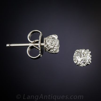A bright and beautiful pair of high-color old mine-cut diamonds (circa 1900) have been reset into sturdy platinum stud earring mountings which have the secondary benefit of enhancing their outlines. Ready for the next 100 years!