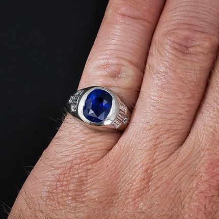A radiant royal-blue, faceted oval cushion-cut sapphire - weighing 5.00 carats - is flush-set in platinum and guarded left-and-right by a trio of bright-white baguette diamonds, together weighing 1.10 carats. A superb and striking, high-caliber estate gent's ring.